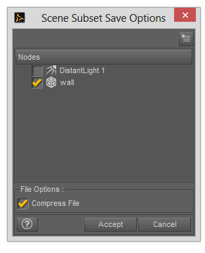 First save it as a scene subset but in a different directory. Navigate to your DAZ3D My Library -> Props directory. There make a new directory for your Props ( I use mcProps) Open that directory and create a new directory for this prop generalWall. Then open that directory and create a new directory colors, but do not open that one. Save our scene subset as gneralWall. In the options dialog uncheck the light so you are saving just the wall.